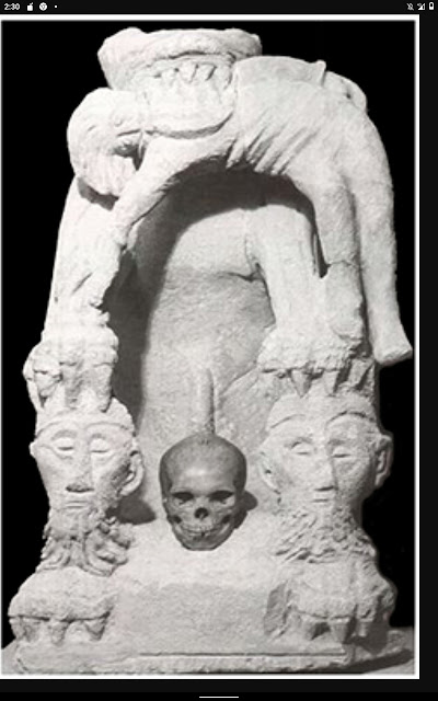 Το συγκεκριμένο άγαλμα κάτω είναι ο βωμός στον οποίο τοποθετούνταν τα κεφάλια των ανθρώπων που θυσιάστηκαν για τον δαίμονα αυτό που αναπαριστά η σκαλιστή μορφή, ένα Hellhound.